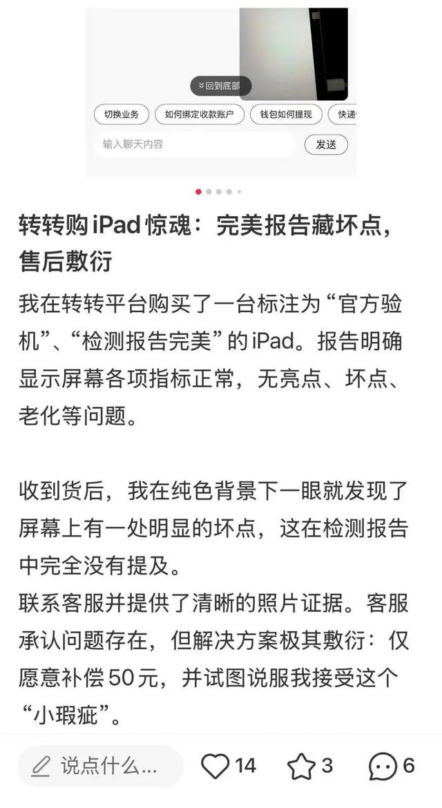 在社交平台上,也有不少网友反映,在“转转”购买的二手数码产品,质检报告与实际不符。有网友发帖表示:“在转转平台购买了一台官方验机、检测报告完美的iPad,收到货后,我在纯色背景下一眼就发现了屏幕上有一处明显的坏点,联系客服并提供了清晰的照片证据,对方承认存在问题,但仅愿意补偿50元。”